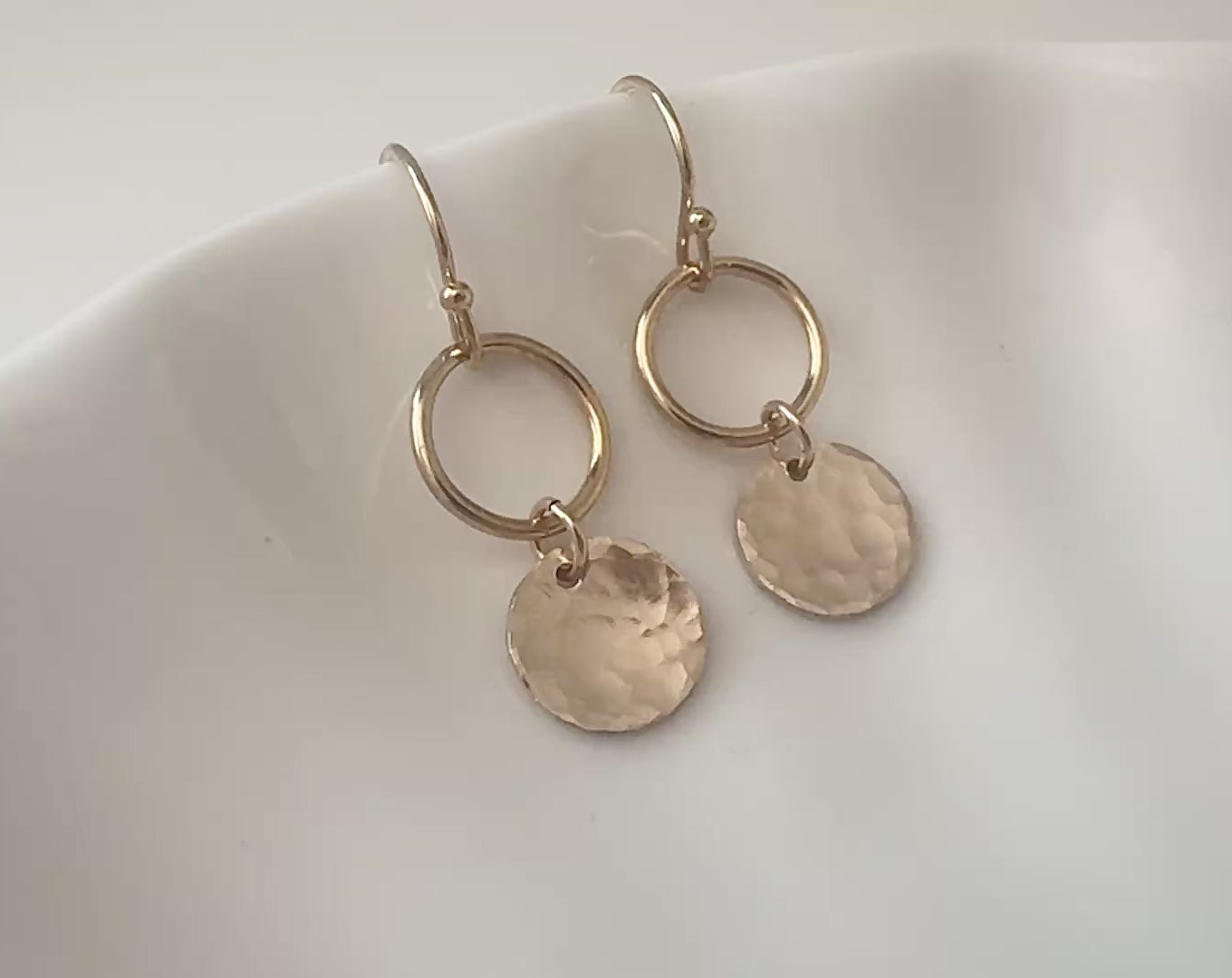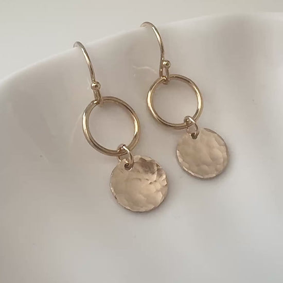A pair of light weight gold-filled drop earrings with circles and textured discs.