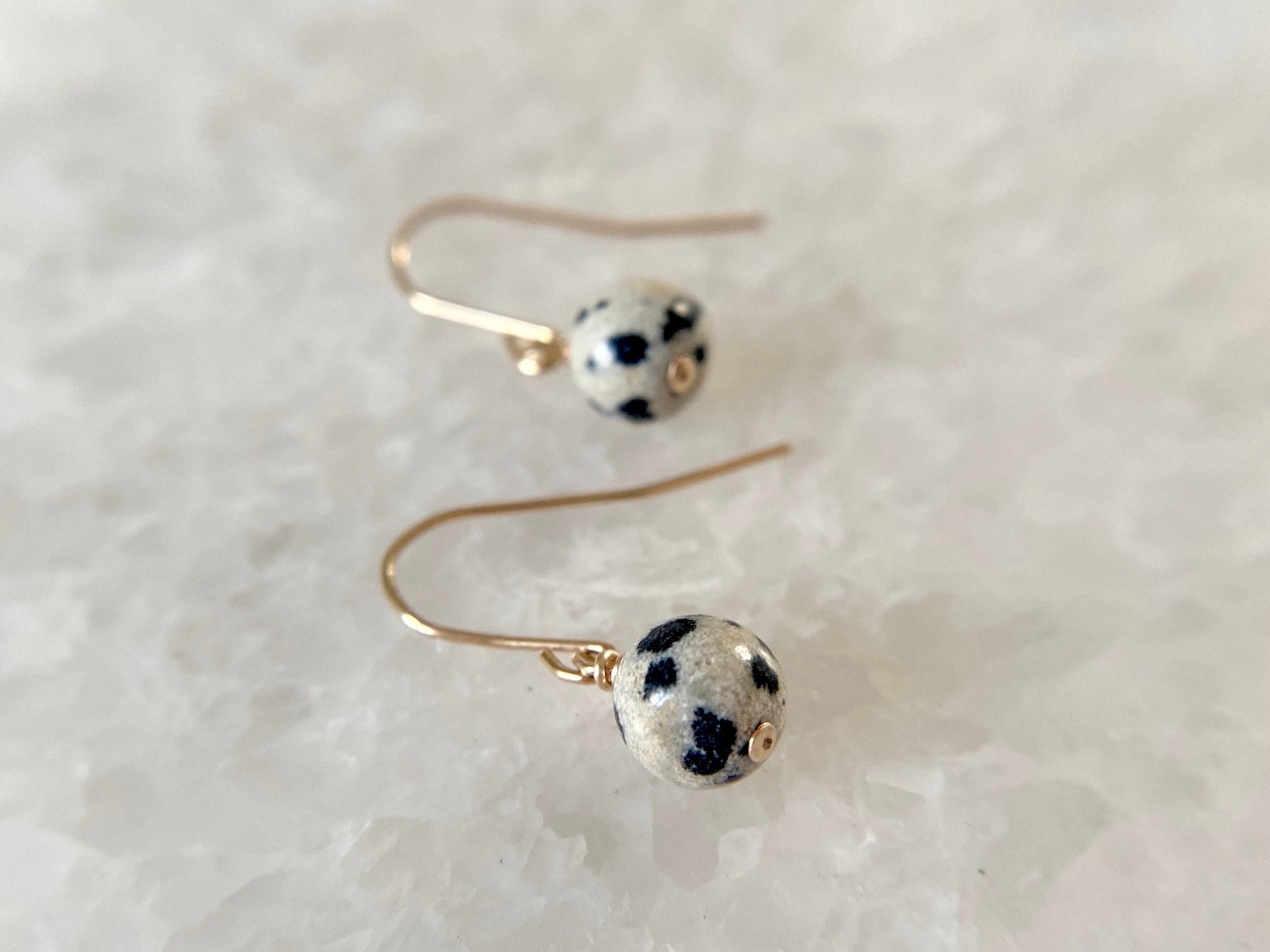 A pair of gold-filled earrings with a petite Dalmatian Jasper bead.