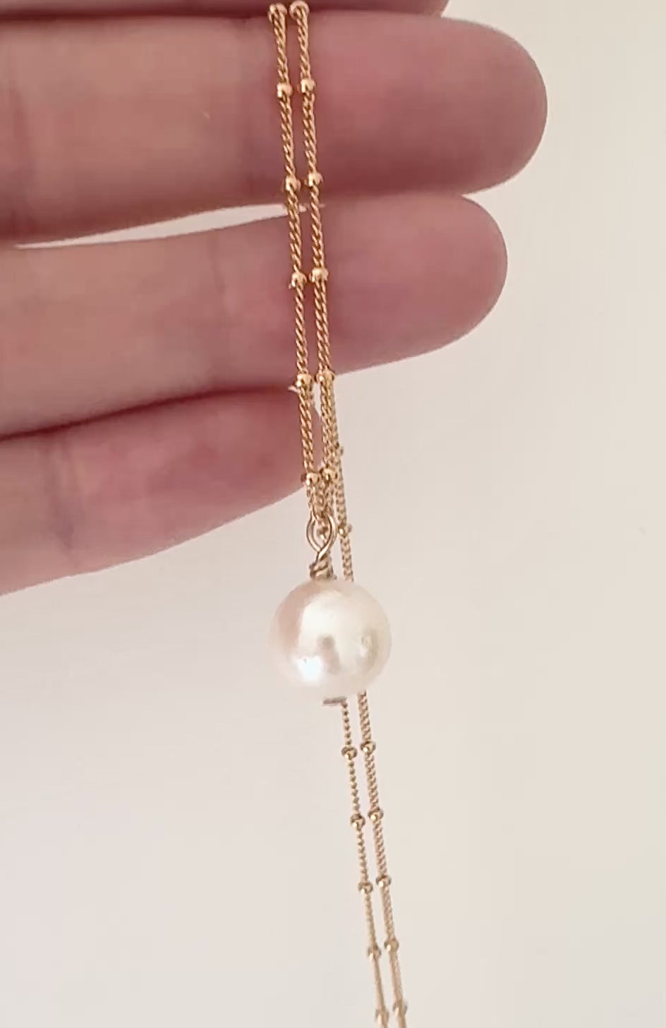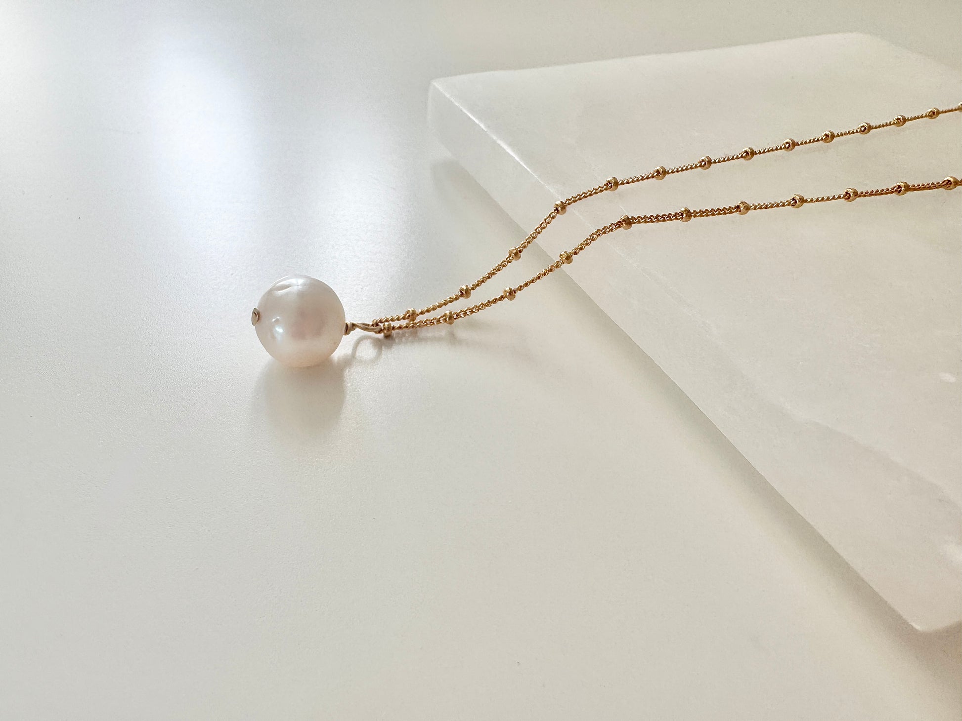 A gold-filled necklace with a 10mm ivory freshwater pearl pendant on an 18” gold filled satellite chain. Each pearl will vary in its natural markings, making the piece truly unique.