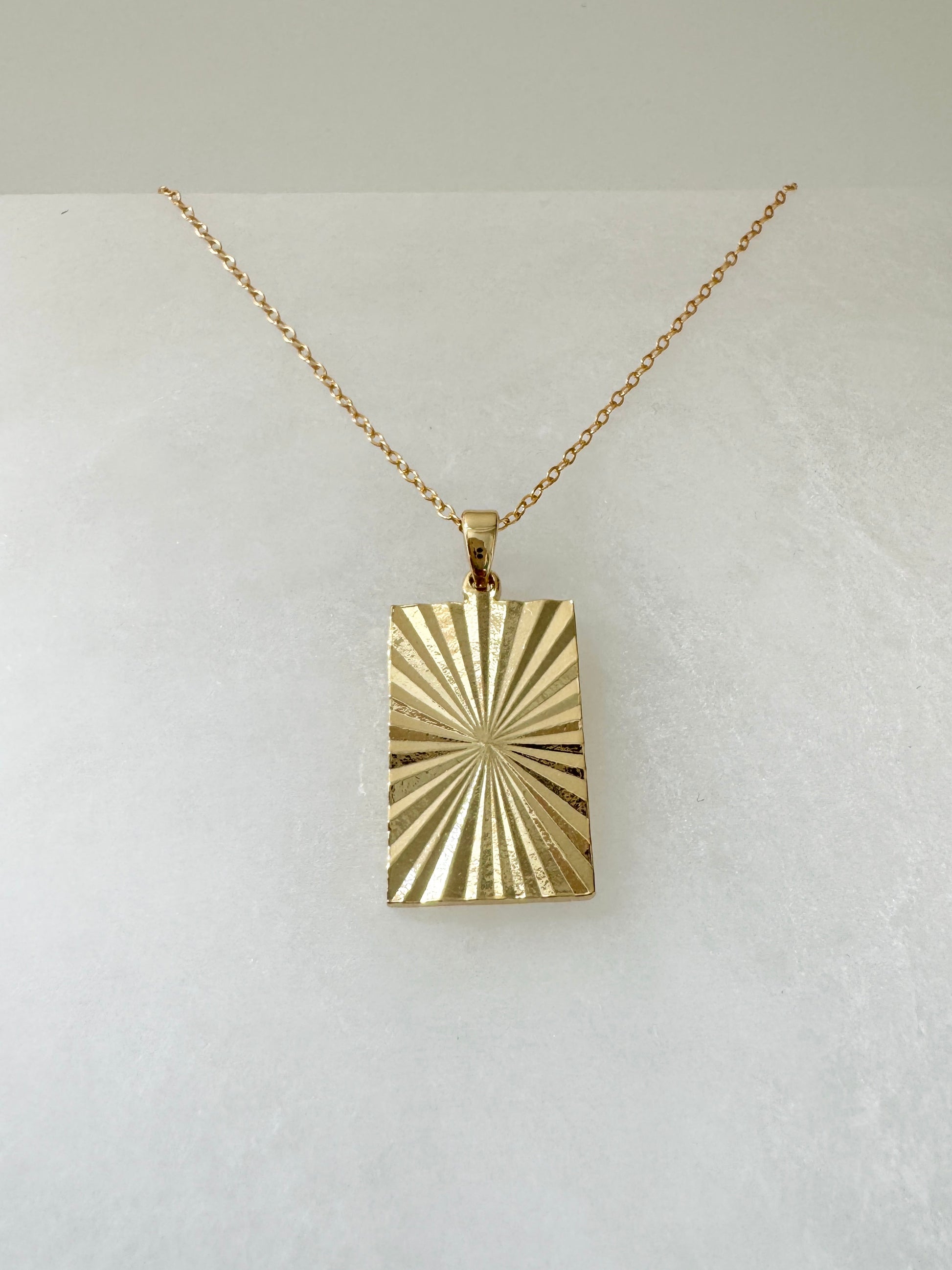 A gold plated pendant necklace on a 16” or 18” gold-plated chain.